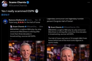 体育资讯9月19日讯 今日,名记Shams的戏仿账号Scams Charina在推特上进行“日常工作”(即发布假消息),称ESPN的名人堂解说员迈克-布林将退休。