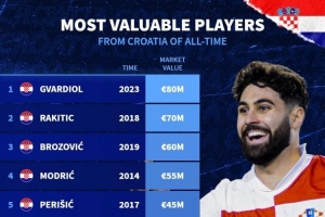克罗地亚球员历史身价榜:格瓦迪奥尔8000万欧居首,拉基蒂奇次席