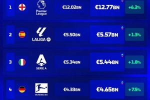 1、英超 127.7亿欧,上涨6.2%