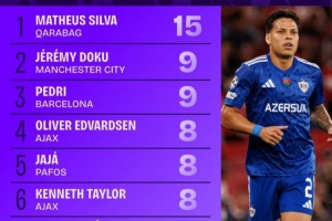 本赛季欧冠被犯规榜:马修斯-席尔瓦15次第一,多库佩德里列二三