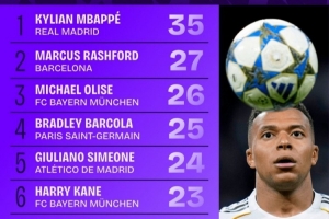 本赛季欧冠对方禁区内触球次数榜:姆巴佩35次第一,拉什福德第二