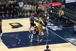 GIF-特纳帽翻昆顿-杰克逊,本场第四次盖帽,此后昆顿回更衣室,步行者官方表示他右腿筋酸痛回归成疑