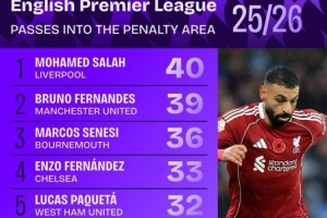 本赛季英超传球入禁区次数榜:萨拉赫压B费居首,恩佐、扎卡在列