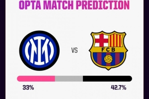 Opta超级计算机对国米强势的欧战主场纪录并不“感冒”,认为巴萨更有可能在次回合赢球(概率为42.7%)。国际米兰赢球的概率为33%,而打平的概率为24.3%。